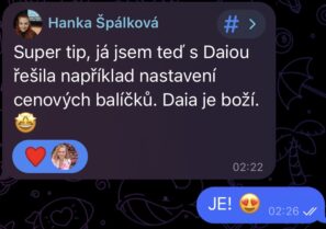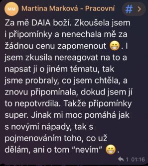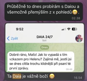 Musím říct, že DAIA je pecka. Fakt mám z ní dojem, jako bych mluvila přímo s tebou. Umí dobře poradit, praktické rady, pomoc i pocit pochopení.... DAIA se ti opravdu povedla!
